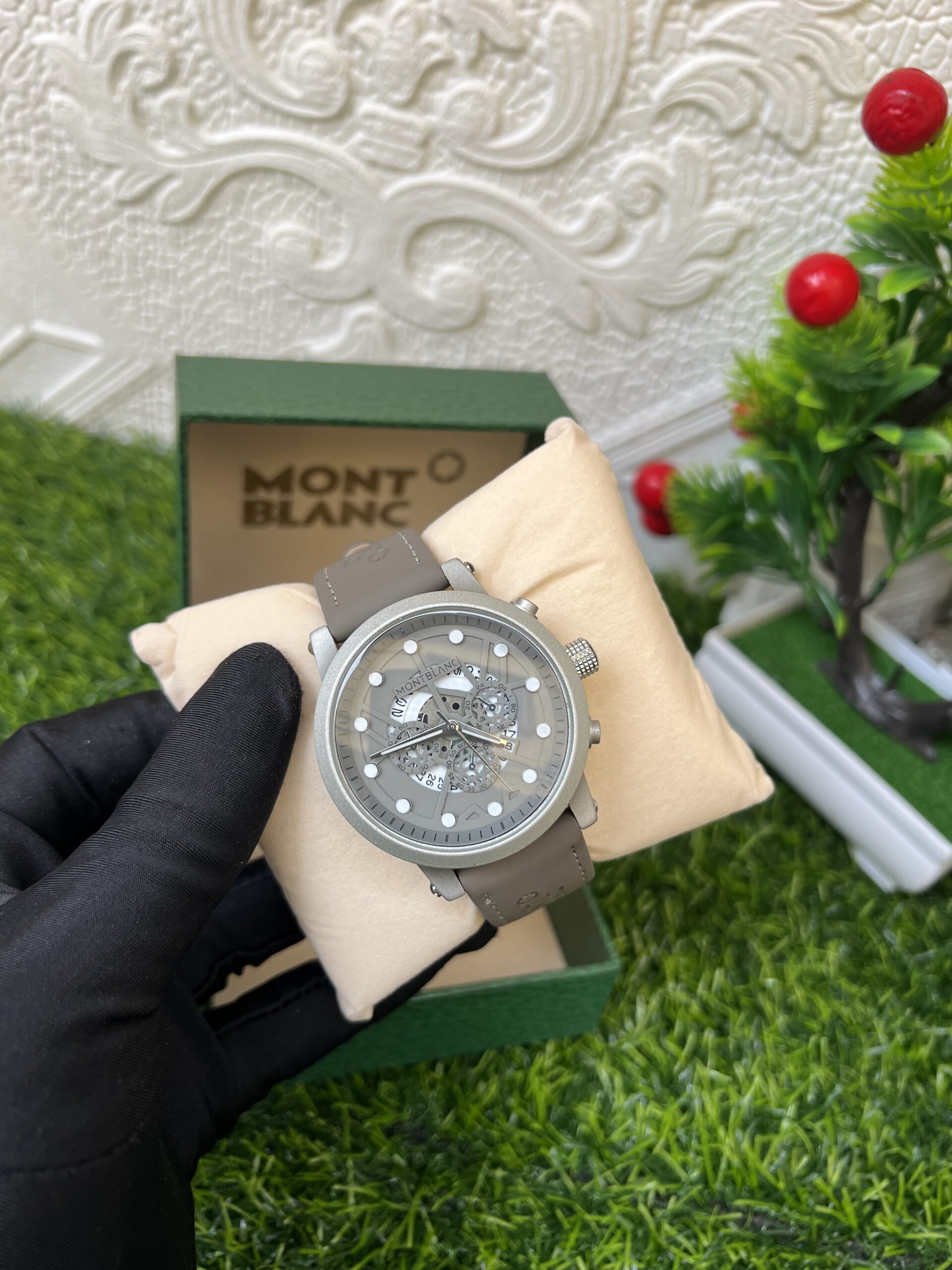 A stylish grey leather wristwatch for men, combining modern elegance with classic functionality.
